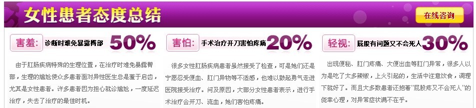 数据表示,40%以上的女性朋友由于担心肛肠疾病手术疼痛而放弃了继续治疗,从而耽误了病情,损害自身健康,而64%女性同胞则由于家庭或者工作原因,担忧手术治疗时间太长而不得不选择了治疗并不明显的物、保守治疗……