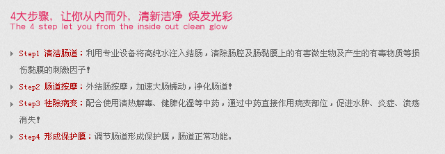 (4)安全,效果理想。先进的水疗设备让物直达病根处,直接作用,在灌输特效中前,专业水疗清洗肠道,高科技设备专业安全,效果理想,解决了一般设备操作的不舒服感、危险性。>>>了解更多大肠水疗治疗信息.