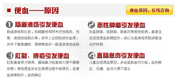 四、溃疡性结肠炎:出血混有黏液或呈脓血便,伴有腹痛、发热、便频等。>>>>>您是由结肠炎引起的便血吗——直接咨询挂号