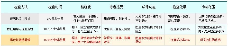 微痛博仕超导肛肠镜针对肛门、直肠下段进行检查。采用医用视频及数字摄像技术,医患双方在检查过程中可同时清晰的观察到放大数十倍的病灶部位。根据病情选择治疗方案。同时可将病灶锁定后打印成像,为治疗前后进行比较提供依据。 >>>>肛肠镜检查的更多问题?检查时间是多久?费用是多少?