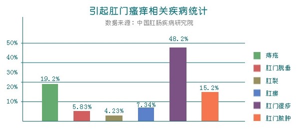 1、肛肠疾病:肛门、直肠、肛管、结肠和小肠疾病如肛瘘、肛裂、内痔脱出、肛乳头炎、直肠脱垂、肛门失禁、湿疣等,可使肛门部过度潮湿,分泌物增加,刺激肛门,是导致肛门瘙痒的常见因素。