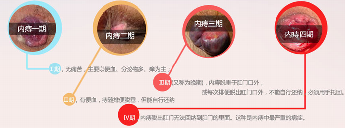 6、痔核脱出:常是晚期症状。多先有便血,后有脱垂,由于痔核体积增大,排便时受到粪便的挤压,使其逐渐与肌层分离而脱出肛外。有时是1~2个痔核同时脱出,有时是全部痔核并带有直肠黏膜一齐脱出。比较初仅在排便时脱出,便后能自行复位。症状较重者,脱出后需要用手推回,或者卧床休息,方能复位。症状更严重者,除排便时脱出外,凡用力、行走、咳嗽、喷嚏、下蹲等动作,都可能使痔核脱出。>>>>>患上内痔怎么办?内痔的专业治疗方法是什么?——咨询在线预约