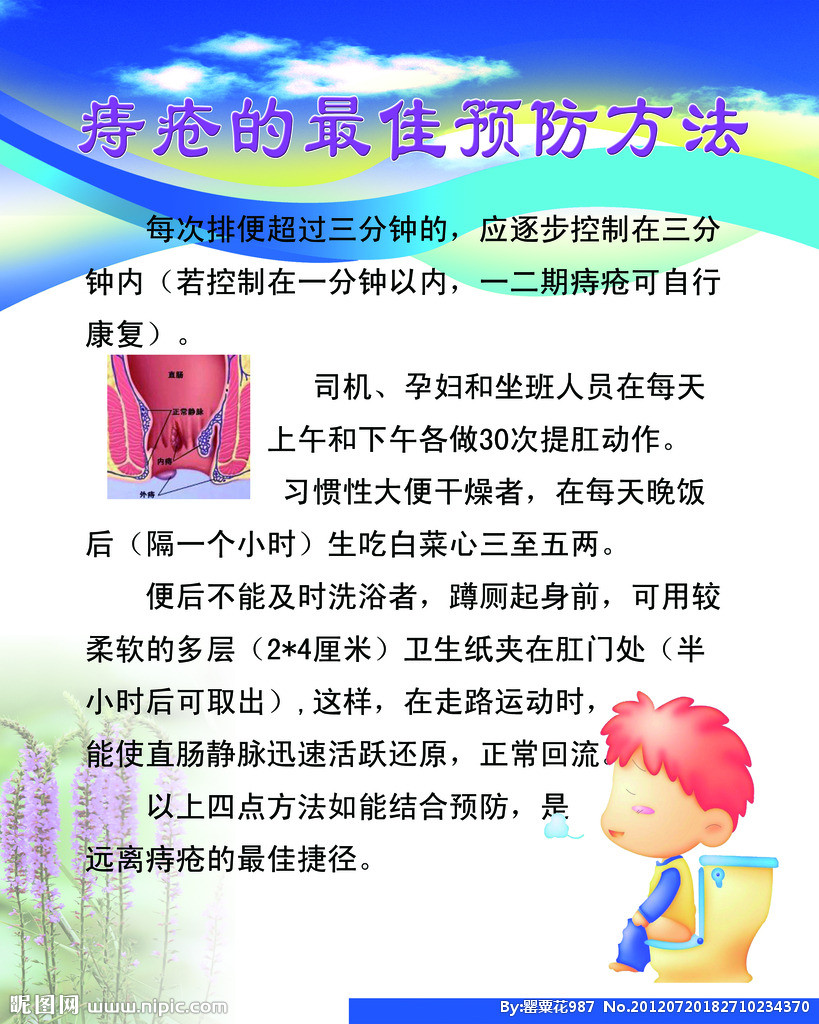 预防痔疮,还应做到生活起居有规律。定时排便,形成规律的条件反射,外出时应多饮水,尽量保持原来的生活习惯。大便时用力要均匀,用软纸擦拭。长时间蹲、坐,会由于重力及局部压迫造成血液循环不良,以致局部淤血水肿,因此,切忌久站、久坐、久蹲,必要时平卧休息。