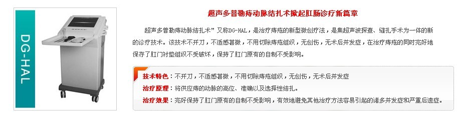 超声多普勒引导下痔动脉结扎术(Dopple guided hemorrhoid artery ligatoion,简称DG-HAL),是治疗痔疮的新型微创疗法,是集超声波探查、缝扎手术为一体的新的诊疗技术。该技术不开刀,不适感甚微,不用切除痔疮组织,无术后并发症,在治疗痔疮的同时完好地保存了肛门衬垫组织不受破坏,保持了肛门原有的自制不受影响,有效地避免其他治疗方法容易引起的诸多并发症和严重后遗症。被业界评为“痔疮治疗史上创时代的手术方式”。 >>>>>内痔疮的专业治疗方式?——咨询在线预约