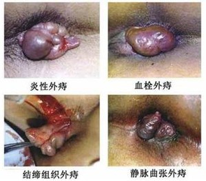 外痔:以疼痛、肿块为主要症状,肛门周围长有大小不等、形状不一的皮赘。根据其病理特点不同,又可分静脉曲张性、结缔组织性、血栓性外痔及炎性外痔四种。其中以炎性外痔比较多见,主要表现为肛缘皮肤皱襞突起,红肿热痛、水肿、充血明显,有压痛,排便时疼痛加重,并有少量分泌物,有的可伴有全身不适和发热;