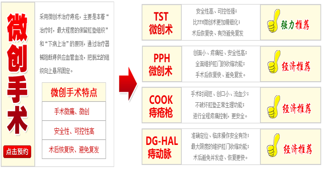 (2)PPH微创术治疗内痔:该术式是在脱垂内痔的上方近内痔上缘的地方环形切除直肠下端肠壁的粘膜和粘膜下层组织,并在切除的同事对远近端粘膜进行问哈,使脱垂的内痔及粘膜被向上悬吊和牵拉,不再脱垂。其有点是手术时间段,出血少,,,被国内外医学专家广泛推崇。