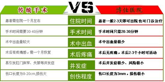 优势:一次性治疗,清除病灶,有效地避免诸多并发症和严重后遗症。对内痔、外痔、混合痔等肛肠疾病,尤其适用内痔(伴大便出血)和混合痔以内痔为主的病人有非常好的疗效。